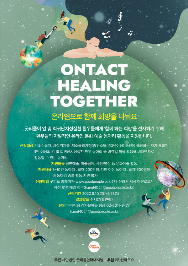㈜한국로슈(대표이사 닉 호리지)와 굿피플(회장 김천수)은 8월 10일부터 암 및 희귀난치성 질환 환자들을 위한 비대면 맞춤형 문화예술 동아리 활동 지원 프로그램인 ‘온택트 힐링투게더(Healing Together)’ 3기 참가자를 모집한다.