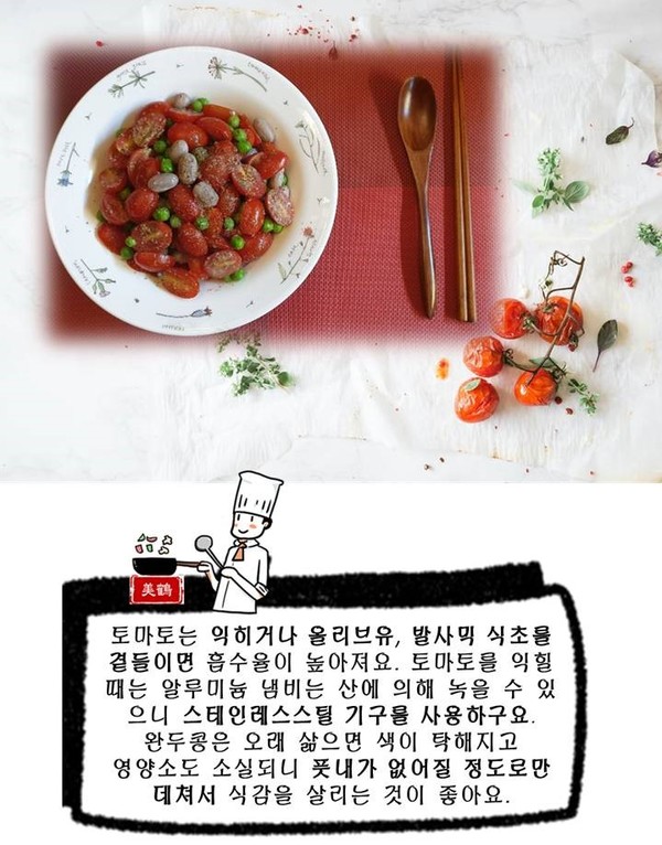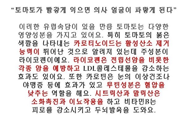 관련기사 참외·콜라비로 담근 '항암 깍두기' 맛은 어떨까? 당근,양파,연근 등 7가지 뿌리채소로 만든 '자연 항암제' 키워드 #토마토요리 #미학부부항암밥상 #항암요리 #항암채식요리 #주경미 #푸드테라피 #토마토효능 편집=홍헌표 기자 bowler1@healer-net.co.kr 다른기사 보기 저작권자 © 캔서앤서(cancer answer) 무단전재 및 재배포 금지 당신만 안 본 뉴스 흰머리가 암과 싸운 흔적이라고? 도쿄대 연구팀 "암세포 방어 메커니즘과 관련" 고 백성문 변호사가 투병했던 부비동암은 어떤 암? 매일 40분씩 빨리 걷기...췌장암ㆍ대장암 위험 17% 감소 '렉라자+리브리반트' 병용요법, 비소세포폐암 최우선 치료옵션 인정 내가 지냈던 암요양병원, 절망 속에서 삶을 다시 배우게 해준 학교였다 내 어릴 적 트라우마... 생애 첫 겨울잠바의 기억 암은 축복의 이름으로 찾아온 선물이었습니다 흰머리가 암과 싸운 흔적이라고? 도쿄대 연구팀 "암세포 방어 메커니즘과 관련" 댓글삭제 삭제한 댓글은 다시 복구할 수 없습니다. 그래도 삭제하시겠습니까? 비밀번호 닫기 기사 댓글 0 댓글 접기 로그인 후 이용 가능합니다. 댓글 내용입력 비회원 로그인 이름 비밀번호 댓글 내용입력 댓글쓰기 계정을 선택하시면 로그인·계정인증을 통해 댓글을 남기실 수 있습니다. 회원 로그인 비회원 글쓰기 이름 비밀번호 자동등록방지 로그인 옵션 창닫기 주요기사 암치료 중 많이 하는 질문 (1) 손발저림 어떻게 해결하나요? 만성골수성백혈병, 항암제 치료 효과 예측 가능 가을의 발 뒤꿈치 겨울이 보네 최근 주목받는 유방암 치료제 버제니오·티루캡은 어떤 약? 혈액검사 호중구 수치 해석하는 법...이럴 땐 즉시 응급실 가야 암, 인생 후반전의 꿈을 열어준 고마운 존재