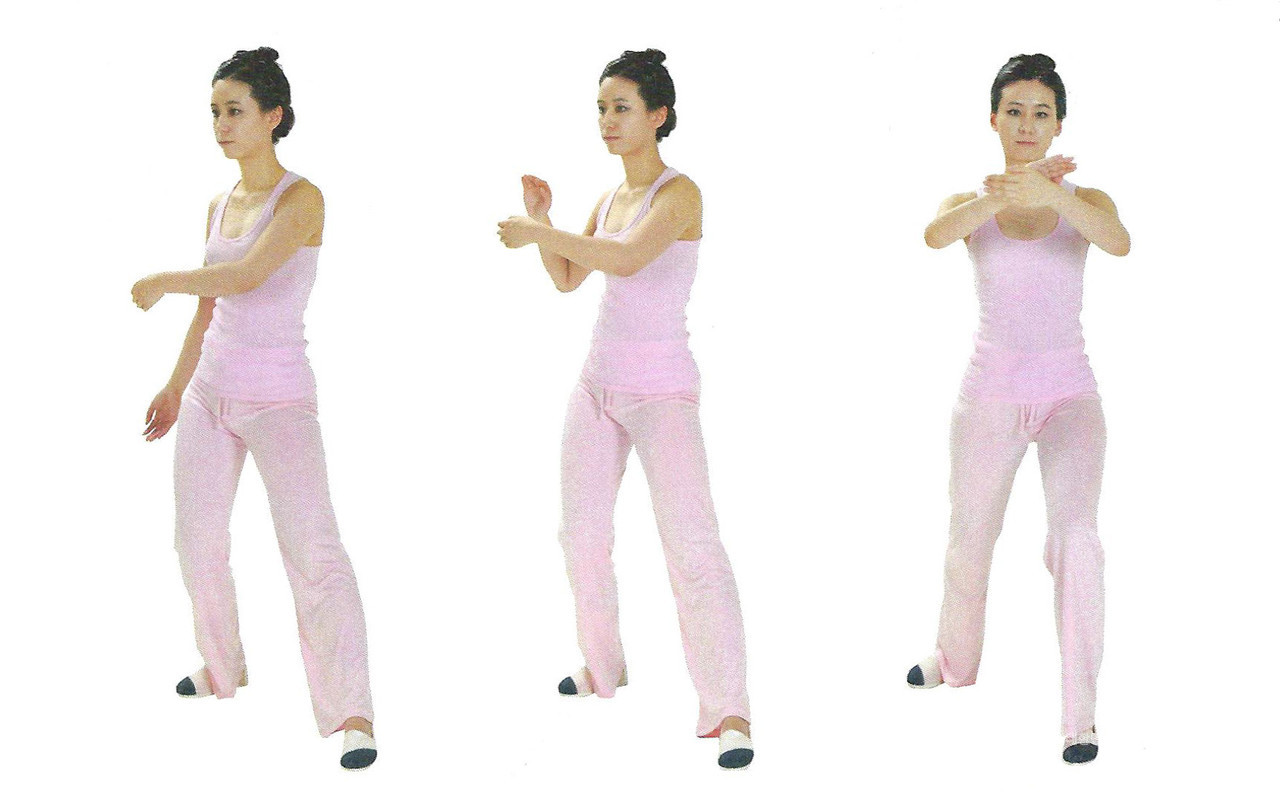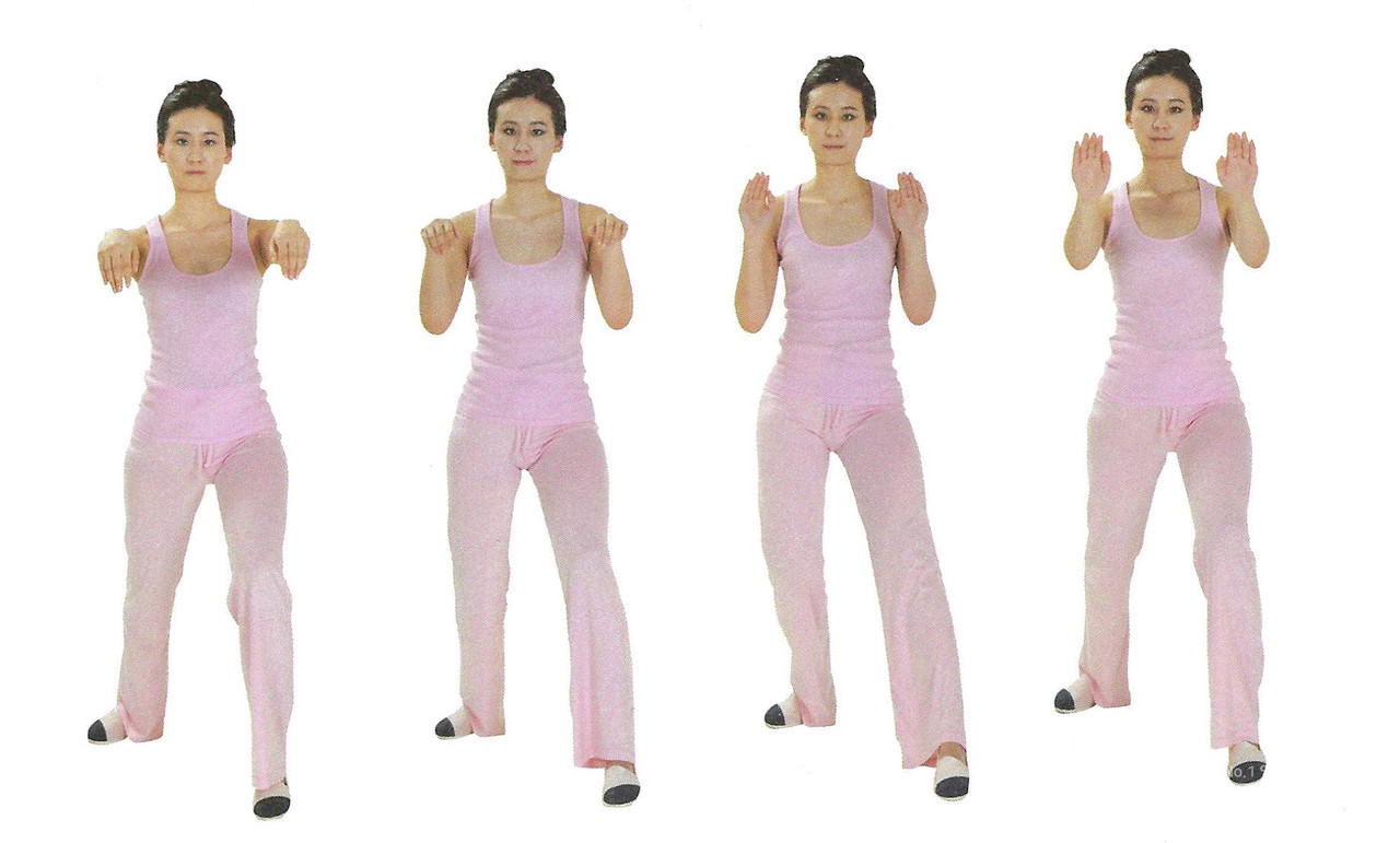 제③= 중심을 앞발로 옮기면서 허리를 앞으로 향해 돌려온다. 앞손은 가슴높이로 들어올려 정면에 오게한 뒤 앞으로 밀어내보내고, 뒷손은 손바닥 중앙의 오목한 부분으로 앞손 엄지 밑의 볼록한 부분과 닿을듯 말듯한 상태까지 마주보게 한다.