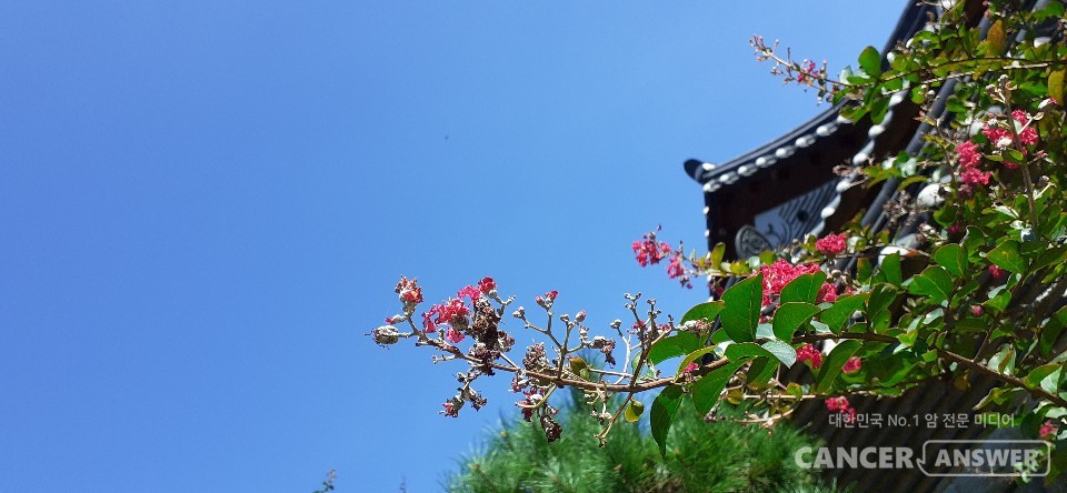 산사의 처마, 바알간 꽃, 파란 하늘이 어우러지면,