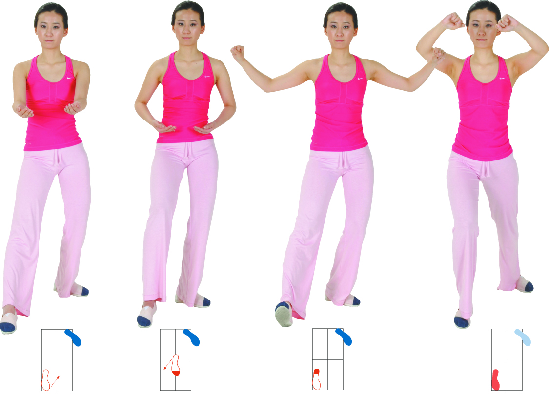 ③ 오른발을 오른쪽 앞으로 옮겨 뒤꿈치를 딛는 동시에 양손은 주먹을 가볍게 쥐면서 좌우로 펼쳐 원을 그리며 올린다.