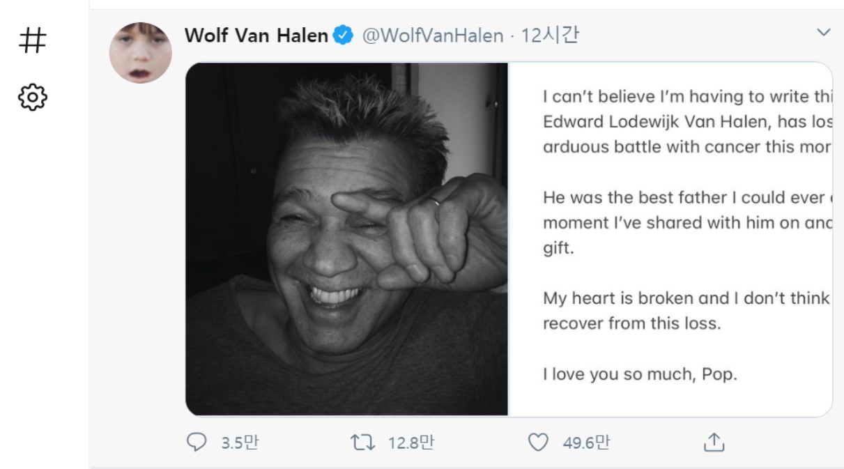 반 헤일런의 아들 볼프강 반 헤일런은 이날 트위터를 통해 "이런 글을 쓰는 것이 믿기지 않지만, 아버지가 오늘 아침 암과의 길고 힘든 싸움 끝에 돌아가셨다"고 알렸다. 볼프강은 "아버지는 내가 기대할 수 있는 최고의 아버지였다. 무대 안팎에서 그와 나눴던 모든 순간이 선물이었다"며 "아빠, 많이 사랑해요"라고 썼다.