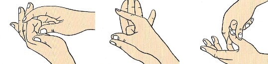 엄지손가락이 아픈 경우에는 아픈 쪽 손의 손바닥이 위를 향하도록 바닥에 두고, 반대편 손의 엄지손가락과 집게 손가락을 아픈 쪽 엄지손가락과 집게손가락 사이에 놓은 다음 양 손가락 사이를 벌린다.