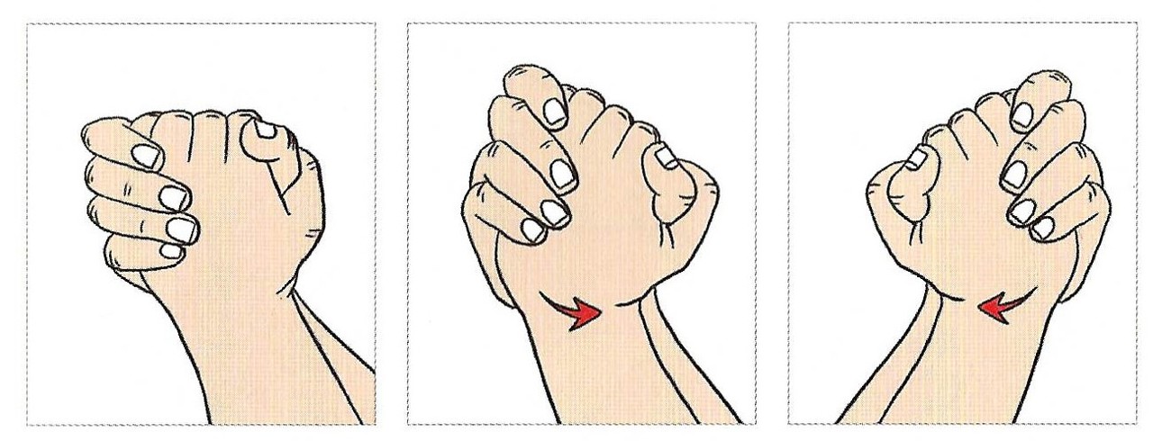아픈 쪽 엄지손가락이 앞으로 보이도록 양손을 깍지 끼고, 아프지 않은 쪽 손목을 이용하여 손목을 좌, 우로 굽혀준다.