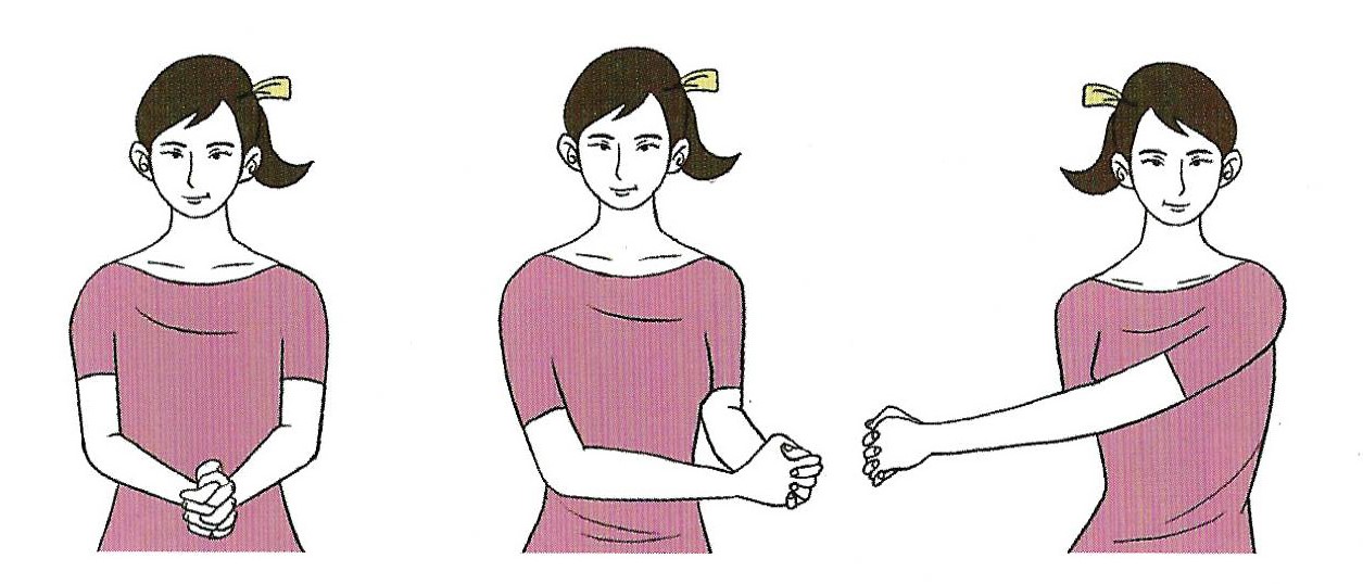 아픈 쪽 엄지손가락이 위로 올라가도록 양손을 깍지 끼고, 아픈 쪽 손바닥이 하늘을 향하도록 팔을 천천히 돌려준 다음 반대방향으로 다시 천천히 돌려준다.