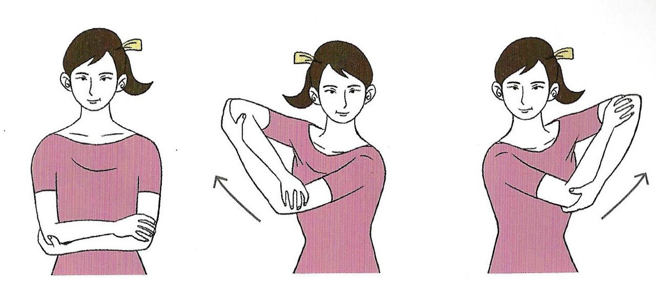 아픈 쪽 엄지손가락이 위로 올라가도록 양손을 깍지 끼고, 아픈 쪽 팔을 몸에 붙이고 직각으로 팔꿈치를 굽힌다. 팔꿈치를 몸에 붙인 상태에서 아픈 쪽 팔 앞을 몸 안쪽으로 천천히 끌어당겼다가 반대 방향으로 천천히 움직인다.