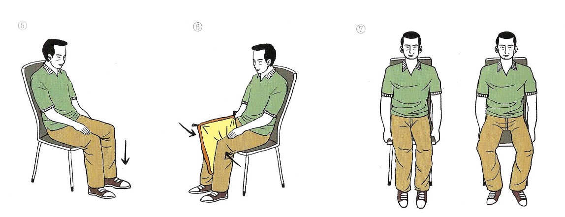 ⑤다리 전체의 힘을 길러주는 운동으로 의자에서 일어나는 기분으로 발로 바닥을 5~10초간 누른 다음, 발에서 힘을 빼는 동작을 되풀이한다. ⑥고관절의 유연성을 길러주기 위해 의자에 앉은 다음 무플 사이에 방석을 끼고 양 무플으로 방석을 5~10초간 조였다가 풀어주기를 반복한다. ⑦고관절의 근력을 강화하기 위해 양 무릎을 붙인 상태로 의자에 앉은 후, 양 다리를 바깥쪽으로 벌렸다 천천히 오므리는 동작을 되풀이한다.