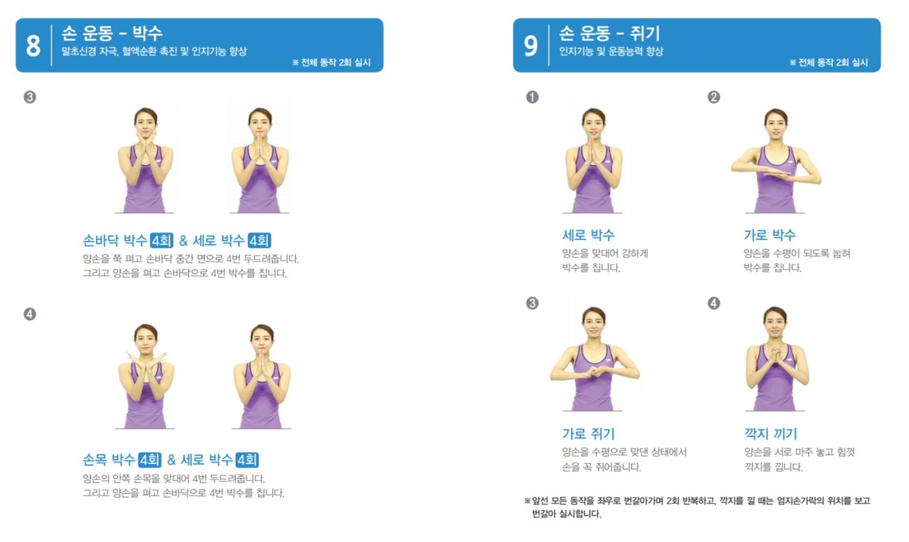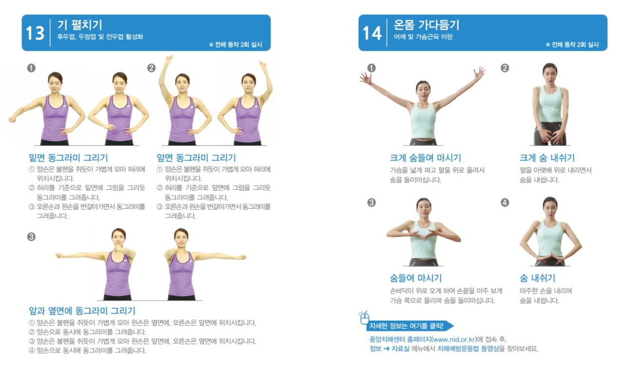 ▶치매 예방 체조 = 팔운동 중심으로 치매를 예방하는 체조들을 소개한다. 뇌의 혈액순환을 늘려 인지기능을 좋게하는데 초점이 맞춰진 동작들. 손뼉을 치는 대신 손으로 머리를 치고, 어깨를 치고, 엉덩이를 치는 동작을 하면 혈액순환이 좋아지고 어깨 회전범위도 확대된다. 또 활발한 움직임이 가능해진다. 손끼리 마주치는 박수는 말초신경을 자극하는 좋은 방법으로, 다양한 방식으로 박수를 칠 수 있다. 양손을 마주 잡고 힘을 주는 것도 자극이 된다. 두팔을 쭉 펴 앞으로 옆으로 위로 밀어주는 것은 상체 전반의 혈액순환에 도움이 되고, 인지기능 및 운동능력이 향상된다. 한 팔씩 교대로 할 수도 있다.