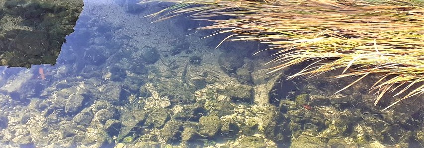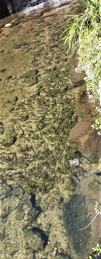 물에 쓸려 넘어진 수초들 사이로, 가득 물고기들이 넘쳐난다.