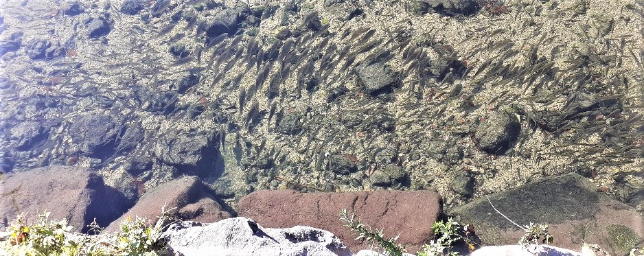 그래도 맑은 하늘이 좋아 동네 하천을 걷다, 문득 발견한 물고기떼.