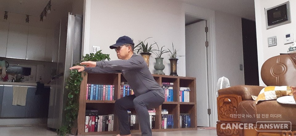 ▶보통 스쿼트 = 가장 기본형이 되는 일반적인 스쿼트. 천천히 굽혀 앉았다 조금 빨리 힘을 주면서 일어나면 된다. 이때 무릎이 지나치게 앞으로 튀어나오지 않게 하기, 내려갈 때 너무 힘주지 않기, 일어섰을 때 엉덩이 근육을 한번 조여주기 등의 간단한 원칙만 지키면 된다. 다만, 앉을 때 양손을 앞으로 나란히 하면 균형을 잡는데 도움이 된다. 발은 11자보다는 약간 좌우로 벌려주는 것이 좋다. 무릎관절의 부담감을 줄일 수 있다.
