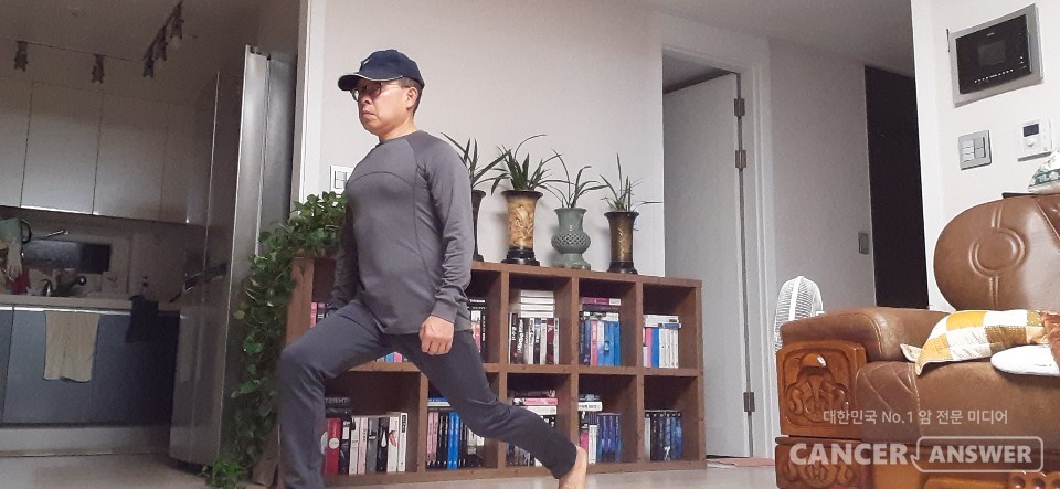 ▶런지 = 한쪽 발에 무게 중심을 두고 한 발의 힘으로 일어나는 스쿼트라고 생각하면 된다. 양발을 나란히 놓고, 엉덩이를 살짝 내민 뒤, 한발에 무게를 싣고 다른 발을 뒤로 적당히 뻗는다. 그리고 디딤발의 근육 사용에 집중하면서 앉았다 일어났다를 되풀이한다. 런지는 앞으로 걸어가듯 하는 방법, 앞으로 발을 내디뎠다 돌아오는 방법, 제자리에서 하는 방법 등 다양하게 변형해 할 수 있다.
