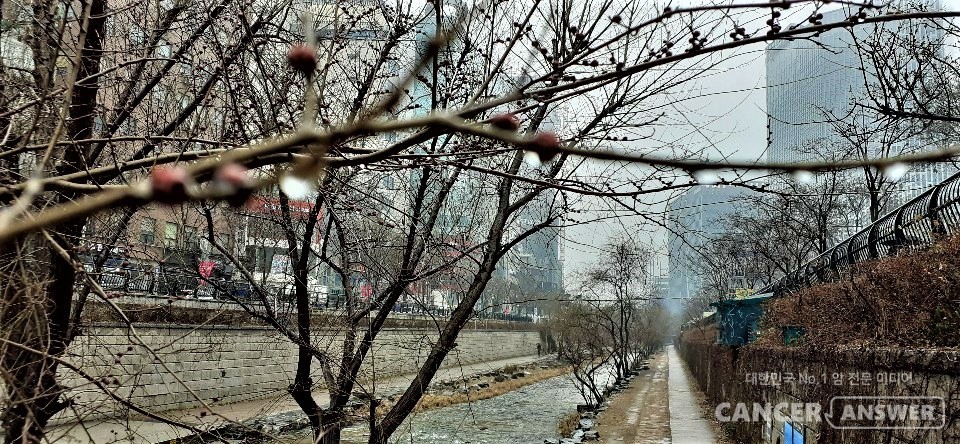 청계천을 찾아 꽃망울 위로 맺힌 빗방울을 보았습니다.