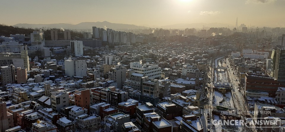 눈덮인 지붕들, 하얗게 바뀐 옥상들 위로 햇살이 비쳐듭니다.
