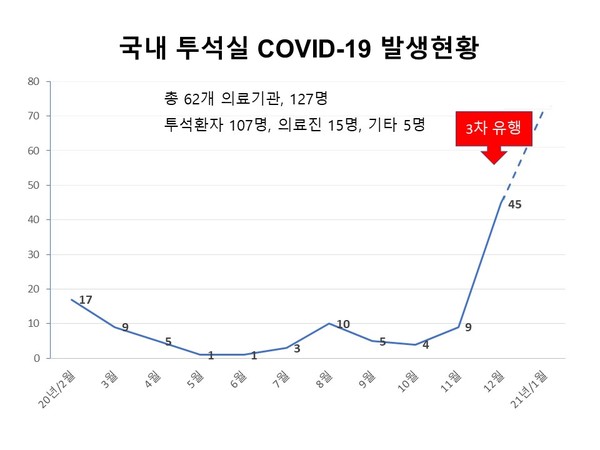 국내 코로나 19(COVID-19) 감염 환자가 줄지 않는 상황에서 인공신장실 관련 코로나19 확진자도 계속 늘고 있다. 대한신장학회(이사장: 양철우 가톨릭의대 성모병원 교수) 조사에 따르면 1월 8일까지 총 64개 혈액투석 기관에서 127명(투석 환자 107명, 의료진 15명, 기타 5명)의 확진자가 발생했다.(그림)