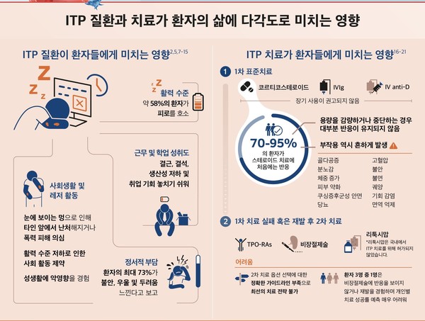 국내 혈액종양내과 의료진을 대상으로 한 설문조사에서 의료진은 “면역성 혈소판 감소증이 환자 삶의 질에 영향을 미치므로 이를 고려한 치료가 필요하다”고 느끼는 것으로 나타났다.