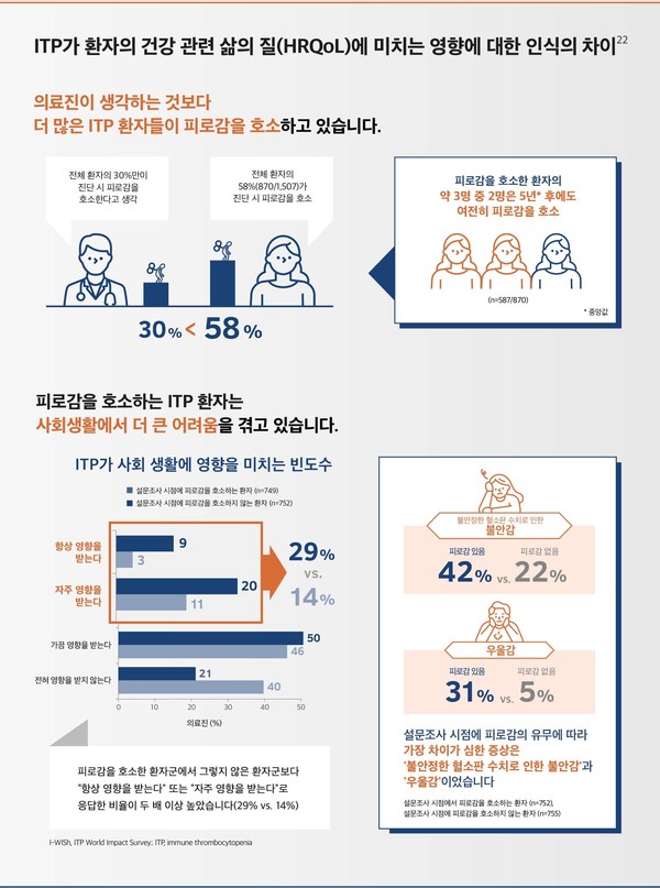 국내 혈액종양내과 의사 28명이 참여한 조사에서 93%가 ‘면역성 혈소판 감소증’은 환자 삶의 질에 영향을 미친다고 응답했다. 의료진이 생각하는 ‘환자가 가장 해결하고 싶어 하는 증상’은 불안정한 혈소판 수치에 대한 걱정(49%)과 출혈(23%), 멍, 피로감, 우울감 순으로 나타났다.