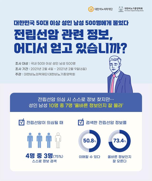 대한비뇨의학재단과 대한비뇨기종양학회가 국내 50대 이상 남성 500명을 대상으로 실시한 설문조사 결과 응답자 75%는 전립선암 정보를 스스로 찾아보지만, 그중 73.4%은 ‘검색한 전립선암 정보가 올바른지 잘 모른다’고 답해 공신력 있고 올바른 전립선암 정보 전달이 필요한 상황이다. 이 설문조사는 전립선암 인식 증진을 위한 ‘블루리본 캠페인’의 일환으로 올해 2월 4일부터 9일까지 국내 50대 이상 남성의 전립선암 관련 정보 획득 방법과 예방 행태를 조사하기 위해 온라인으로 시행됐다.