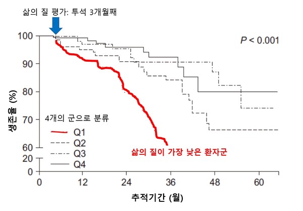 연구 결과 투석 3개월째 삶의 질이 높게 유지되는 환자가 상대적으로 삶의 질이 좋지 않은 환자에 비하여 장기적인 생존이 유의하게 우월하였다. 다양한 삶의 질 지표 중 콩팥병과 관련된 증상이 심하고, 사회적인 도움과 지지의 정도가 약하며, 의료진의 격려가 적다고 환자가 느낄수록 환자의 예후가 불량하였다. 또한 육체적인 건강 상태가 나쁘다고 느낄수록 예후가 좋지 않았다.