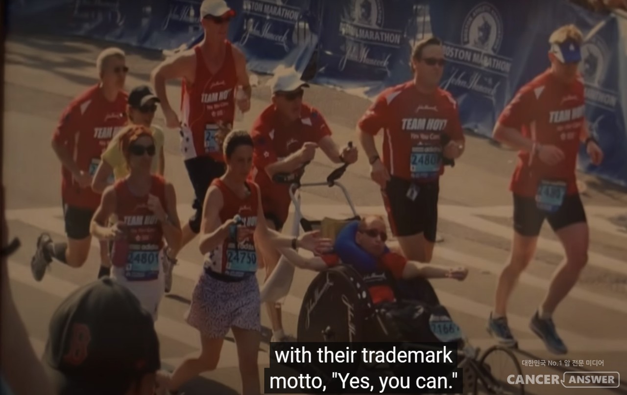 팀 호잇이 해낸 놀라운 일들 때문이다. 그들은 1977년부터 2016년까지 40년간 마라톤 72회 완주, 트라이애슬론 257차례(철인코스 6회) 등 1130개의 대회에서 완주했다. 보스턴 마라톤만 32회 완주의 대기록을 갖고 있는 아버지와 아들이다. 아버지가 특별히 제작된 휠체어를 밀면서 뛰고, 고무보트에 아들을 태우고 앞에서 끌면서 헤엄치고, 자전거의 앞부분에 보조안장을 설치해 거기에 아들을 태우고 사이클링을 한다. 완주만 해도 대단할텐데, 규정시간을 준수하면서 멋진 레이스를 펼친다. 그냥 한번 이벤트를 펼친 것이 아니라 삶 전체가 도전이고, 그 도전에서 놀라운 성과를 일궈냈다.
