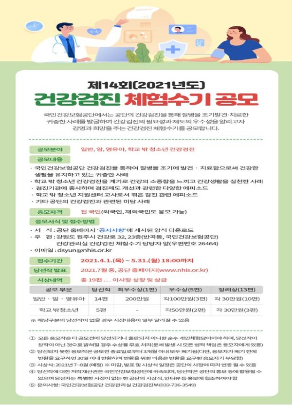 국민건강보험공단이 5월 31일까지 건강검진 체험수기를 공모한다.