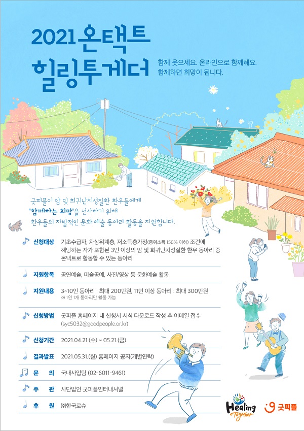 한국로슈(대표이사 닉 호리지)는 국제구호개발 NGO인 굿피플(회장 김천수)과 21일부터 암 및 희귀난치성 질환 환자들을 위한 비대면 맞춤형 문화예술 동아리 활동 지원 프로그램인 ‘온택트 힐링투게더’ 프로그램의 4기 참가자를 모집한다고 밝혔다. 이번 4기 힐링 투게더는 참가자들이 코로나19 상황에서 건강하고 안전하게 문화예술활동을 하고 희망을 나눌 수 있도록 온택트 방식으로 진행할 예정이다.