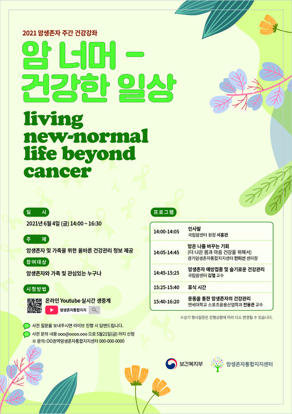 4일 진행되는 ‘암생존자 주간 건강강좌’에서는 △암은 나를 바꾸는 기회(전미선 경기권역암생존자통합지지센터장) △암생존자 예방 접종 및 슬기로운 건강관리(김열 국립암센터 교수) △운동을 통한 암생존자의 건강관리(전용관 연세대 교수)를 다룬다.