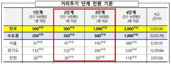 코로나19 사회적 거리두기 단계는 인구에 따라 나뉜다. 수도권은 1일 평균 확진자가 250명 이상이면 2단계, 500명 이상이면 3단계다. 중대본 발표에 따르면 지난 1주간 수도권의 1일평균 확진자는 465명이다.