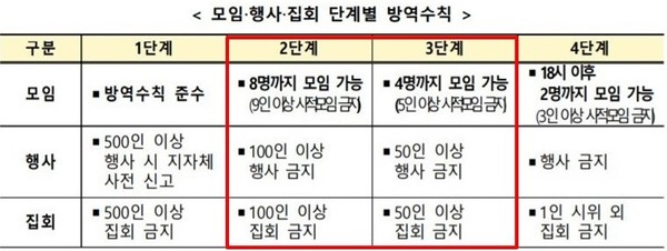 이에 따라 정부는 유행 규모가 커지면 단계를 격상하겠다는 입장을 밝혔다. 수도권을 기준으로 사회적 거리두기 2단계와 3단계가 어떻게 구분되는지 표와 함께 알아본다.