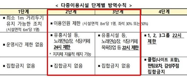 다중 이용 시설과 관련해 가장 큰 차이는 운영 시간이다. 2단계에서는 식당, 카페는 물론 노래연습장도 자정까지 운영할 수 있지만, 3단계가 되면 밤 10시로 2시간 앞당겨진다.