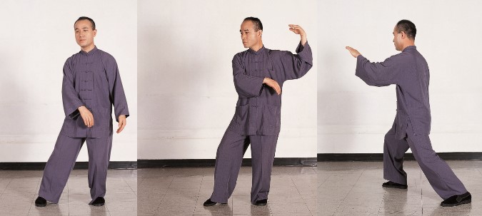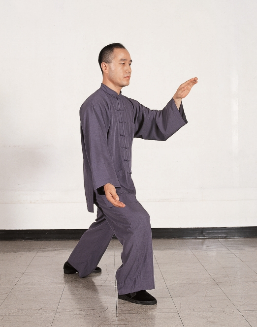 ④ 중심을 오른발로 옮기면서 점차 발끝을 내려딛고 왼손 장(掌)은 허리를 따라 앞으로 찔러나가면서 팔꿈치를 가라앉히고 손목을 어깨 높이로 내려앉히며 장을 세워 앞으로 향해 밀고 나간다. 왼발끝은 약간 들어 허리를 따라 앞으로 45도 돌려오고 무릎을 쓸듯 오른쪽으로 돌려가는 오른손 루는 사타구니를 보호하며 오른쪽 무릎을 지나 오른쪽 넓적다리 옆으로 오면 손바닥을 뒤집어 위를 향하게 한다.