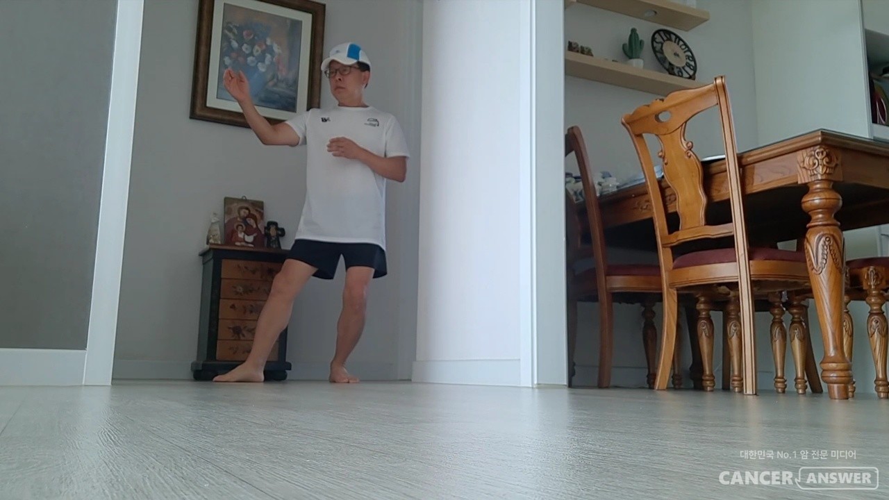 5. 체중이동을 하면서 허리 비틀기 = 태극권의 웅경공이다. 곰의 움직임을 흉내 낸 동작. 양 발을 적당히 벌리고 서서 한쪽 다리 위에 체중을 실었다 천천히 다른 발로 체중을 옮기는 동작이다. 그 움직임에 맞춰 느슨하게 내린 팔과 허리를 뒤틀게 된다. 허리는 최대한 비틀고, 무릎은 돌아가지 않게 꽉 잡아두는 것이 중요하다. 하체운동이지만, 내장이 활성화되어 면역력과 허리뱃살을 줄이는 효과도 크다.