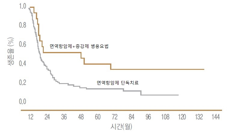최근 면역항암제와 싸이모신알파1(면역증강제) 병용 투여시 환자의 전체 생존율이 개선되고 암 세포의 전이가 억제된다는 연구결과가 실린 국제적 의료저널들이 소개되고 있다.