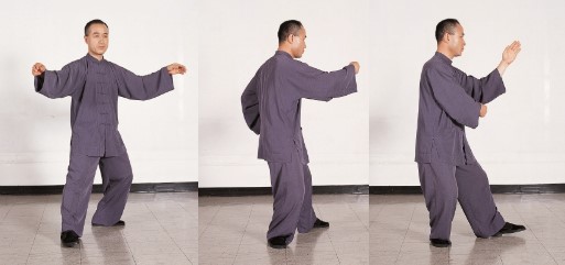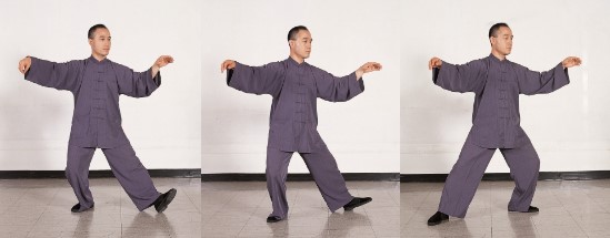 ③ 왼발 발끝을 왼쪽 정면으로 똑바로 내려딛으면서 중심을 옮겨 견고히 하고 오른발은 허(虛)가 되게 한다.