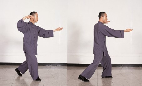 ⑥ 왼쪽 뒤꿈치를 안쪽으로 돌려오며 약간 들어 앞쪽 정면으로 옮겨 뒤꿈치를 살짝 딛는다. 동시에 왼손은 손바닥이 오른쪽을 향하게 장(掌)을 세워 왼쪽 어깨 앞 위쪽으로 찔러 올려가 손목이 어깨 높이가 되게 하고, 오른손은 왼팔 바깥쪽 팔뚝을 따라 훑듯이 내리며 주먹을 쥐어 왼팔 팔꿈치 아래 둔다.
