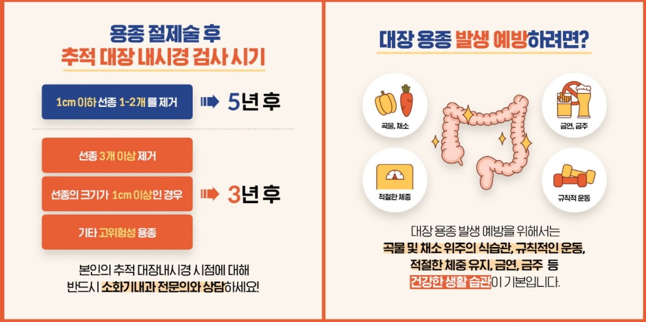 대한소화기내시경학회 측은 "자료에 따르면, 용종 제거를 통해 대장암 발생율은 70-90%, 사망률은 50% 감소 가능하다"며 "대장내시경 검사를 통해 선종성 용종의 진단, 절제 및 치료가 그 자리에서 가능하다"고 설명했다. 대장암 전단계인 선종이 발견되면 용종 절제술이 필수다. 용종 절제술 후에도 3~5년 추적 대장내시경 검사를 빼먹지 않고 지속하는 것이 필요하다.