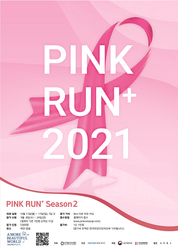 아모레퍼시픽이 비대면 러닝 대회 ‘2021 핑크런 플러스’ 하반기 대회 참가자를 모집한다. '핑크런’은 핑크리본 캠페인의 대표 프로그램 중 하나로 유방 건강 인식 개선을 위해 지난 20년간 진행해 왔다. 참가자들의 안전을 고려해 작년부터는 비대면 방식으로 개최하고 있다.