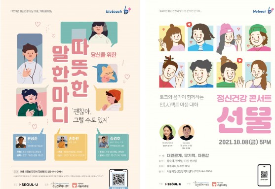 정신건강 기획 캠페인 ‘따뜻한 말 한마디(부제: 괜찮아, 그럴 수도 있지)’로 △잠시 쉬어가도 괜찮아(편성준 작가) △잠시 흔들려도 괜찮아(손하빈 대표) △가끔 넘어져도 괜찮아(김경호 앵커)라는 주제로 온라인 강연이 준비됐다. 이 강연은 10월 5일부터 7일까지 오전 10시 유튜브 채널 ‘블루터치’에서 시청할 수 있다.