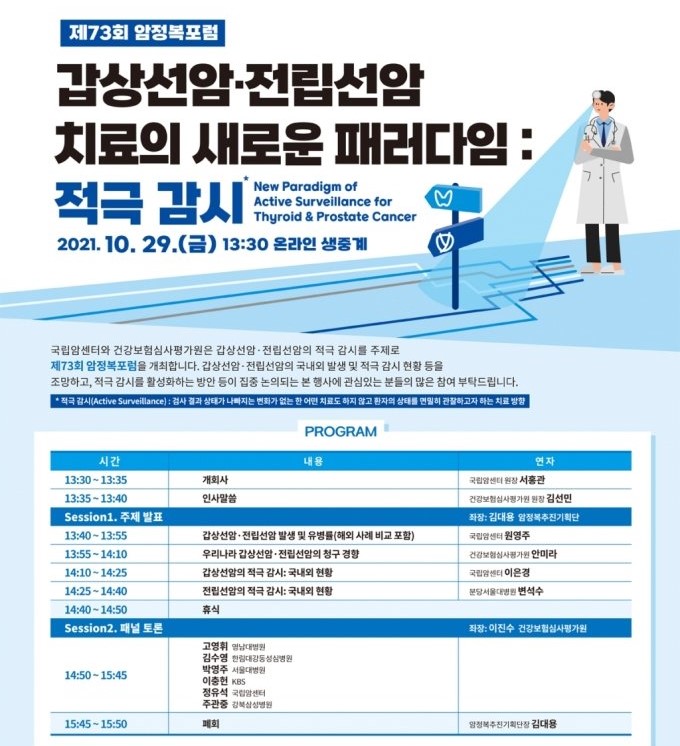 포럼은 갑상선암과 전립선암의 국내외 발생 및 적극 감시 현황 등을 조망하고 적극 감시 활성화 방안을 집중 논의하는 종합토론으로 구성된다. 제1부에서는 △갑상선암․전립선암 발생 및 유병률(국립암센터 원영주) △우리나라 갑상선암․전립선암의 청구 경향(건강보험심사평가원 안미라) △갑상선암의 적극 감시: 국내외 현황(국립암센터 이은경) △전립선암의 적극 감시 : 국내외 현황(분당서울대병원 변석수) 등 주제발표가 진행된다.