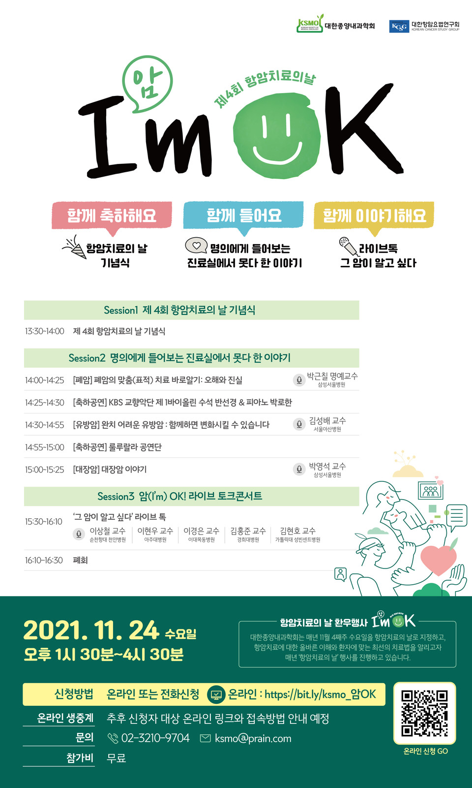 대한종양내과학회(이사장 김태원)와 대한항암요법연구회(회장 장대영)가 11월 24일 오후 1시부터 ‘제 4회 항암치료의 날’ 행사를 온라인 생방송으로 진행한다.