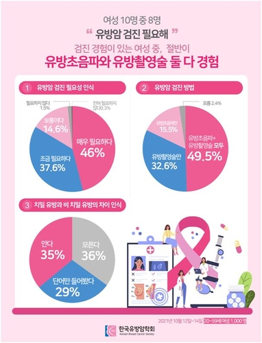 수도권 및 5대 광역시에 거주하는 20∼50대 여성 1000명을 조사한 결과, 응답자의 48.8%가 평소에 유방암을 걱정한다고 답했다. '매우 걱정한다' 14.1%, '조금 걱정한다' 34.7%였다. '유방암 검진이 얼마나 필요하다고 생각하는지'에 대한 질문에는 46.0%가 '매우 필요하다', 37.6%가 '조금 필요하다'고 응답해 유방암 검진의 중요성을 인지하는 수준이 높았다.