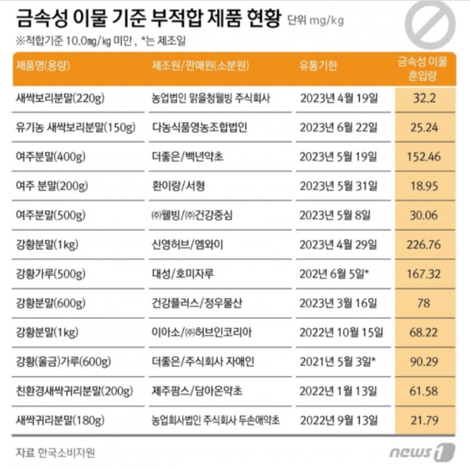 시중에 판매되는 새싹보리·여주·울금·강황·새싹귀리 등 분말식품 12개에서 안전기준을 최대 22배 초과한 쇳가루가 검출됐다. 한국소비자원은 온라인 쇼핑몰에서 유통·판매되는 건강분말 식품 40개 제품을 대상으로 안전실태를 조사한 결과, 이같이 나타났다고 10일 밝혔다.
