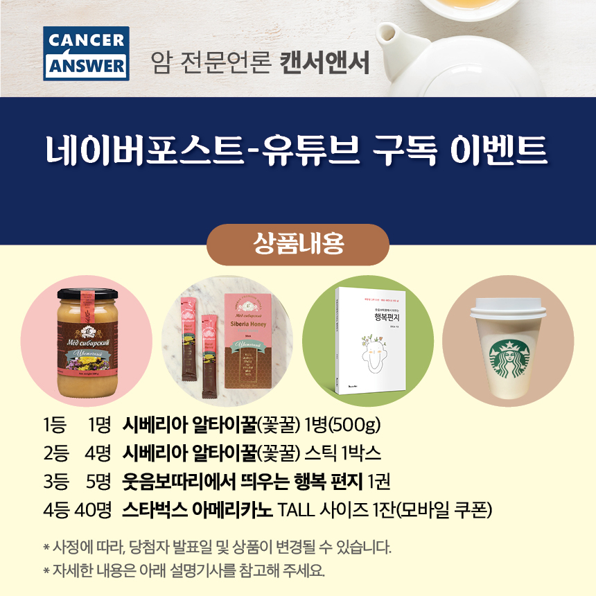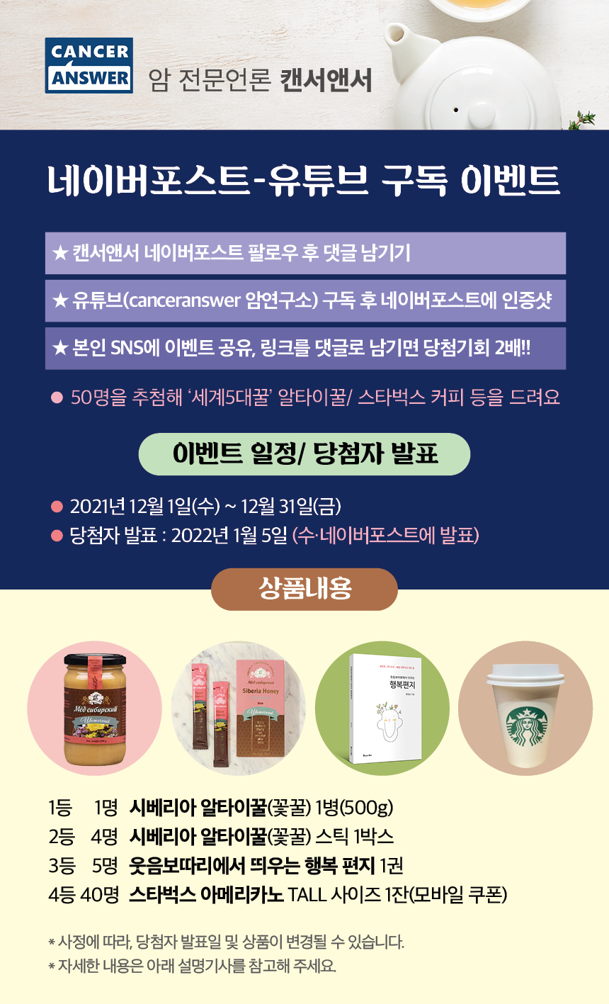 암환우에게 맞춤형 정보를 제공하고 행복한 삶의 경험을 나누는 암 전문언론 ‘캔서앤서’가 연말을 맞이하여 구독회원 가입 이벤트를 진행한다. 캔서앤서 네이버 포스트나 캔서앤서 유튜브 채널 'CancerAnswer 암연구소'를 구독하면 추첨을 통해 50명을 선정, '세계 5대 꿀'로 꼽히는 시베리아 알타이꿀와 스타벅스 커피 쿠폰 등을 선물한다.