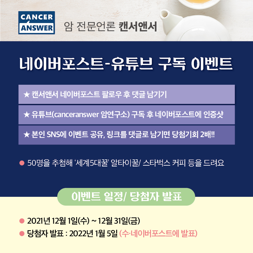 12월 한달동안 진행되는 구독 이벤트 당첨자 발표는 2022년 1월 5일 캔서앤서 네이버포스트에 발표할 예정이다. 이벤트 참여 방법은 다음과 같다.