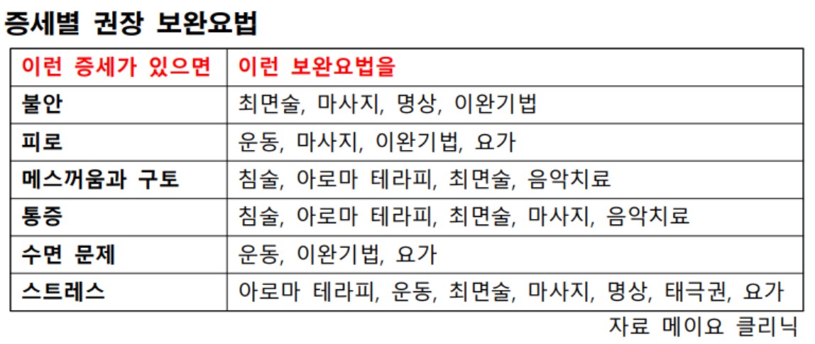 메이요 클리닉은 "암 보완치료법은 암을 치료하는 데 직접적인 역할을 하지 않을 수도 있지만, 암과 암 치료로 인한 여러 증상에 대처하는 데 도움을 줄 수도 있다"면서 "불안, 피로, 메스꺼움과 구토, 통증, 수면 곤란, 스트레스와 같은 일반적인 증상들이 보완요법에 의해 줄어들 수 있다"고 설명했다.