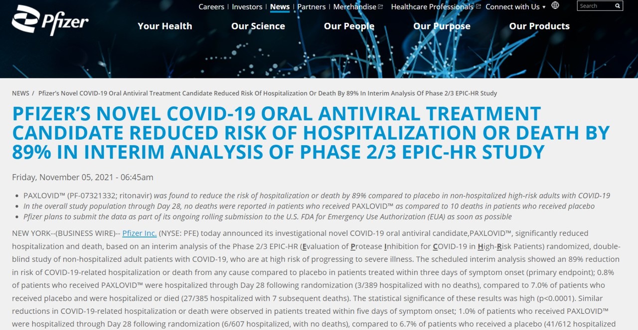 미국 제약회사 화이자는 14일(현지시각) "코로나19 치료를 위한 경구용 항바이러스제 팍스로비드가 코로나19 고위험군 입원ㆍ사망 확률을 89%까지 낮추는 것으로 확인됐다"고 발표했다. 미국 언론에 따르면, 조 바이든 미국 대통령은 "이 치료법이 허가를 받는다면 팬데믹에서 벗어나는 길에 중대한 진전을 보여줄 것"이라고 환영했다.