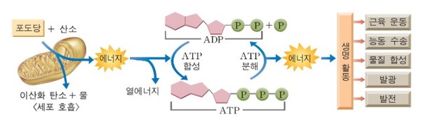 우리가 먹은 음식은 소화·흡수 과정을 거쳐 포도당, 아미노산, 지방산으로 바뀝니다. 우리 몸의 세포에서는 이를 원료로 ATP(아데노신3인산)라는 유기화합물과 세포 성장에 필요한 물질이 만들어집니다. 이 과정이 ‘세포 에너지 대사’입니다. 우리 몸에서 실제로 사용되는 ‘에너지 화폐’인 ATP는 ADP(아데노신2인산)와 무기 인산으로 분해되면서 에너지를 방출하는데, 이 에너지의 40%는 근육 운동, 능동 수송, 물질 합성 등의 생명 유지활동에 사용되고 60%는 열 에너지로 방출됩니다.