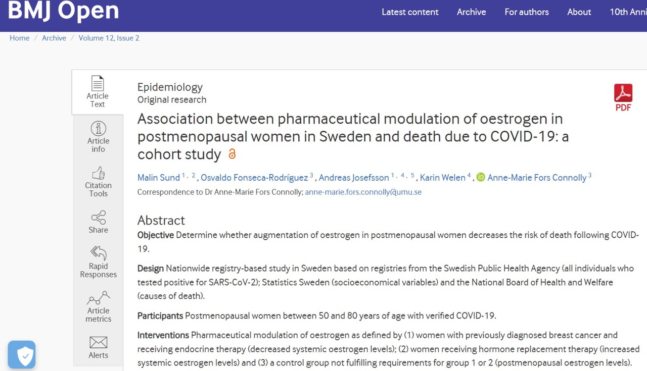 코로나19에 감염된 50세 이상 폐경여성 중 HRT의 일환으로 에스트로겐을 투약한 사람이 그렇지 않은 사람보다 사망할 확률이 절반 미만으로 나타났다는 스웨덴 연구진의 연구가 영국의학협회지 'BMJ 오픈'에 발표됐다.