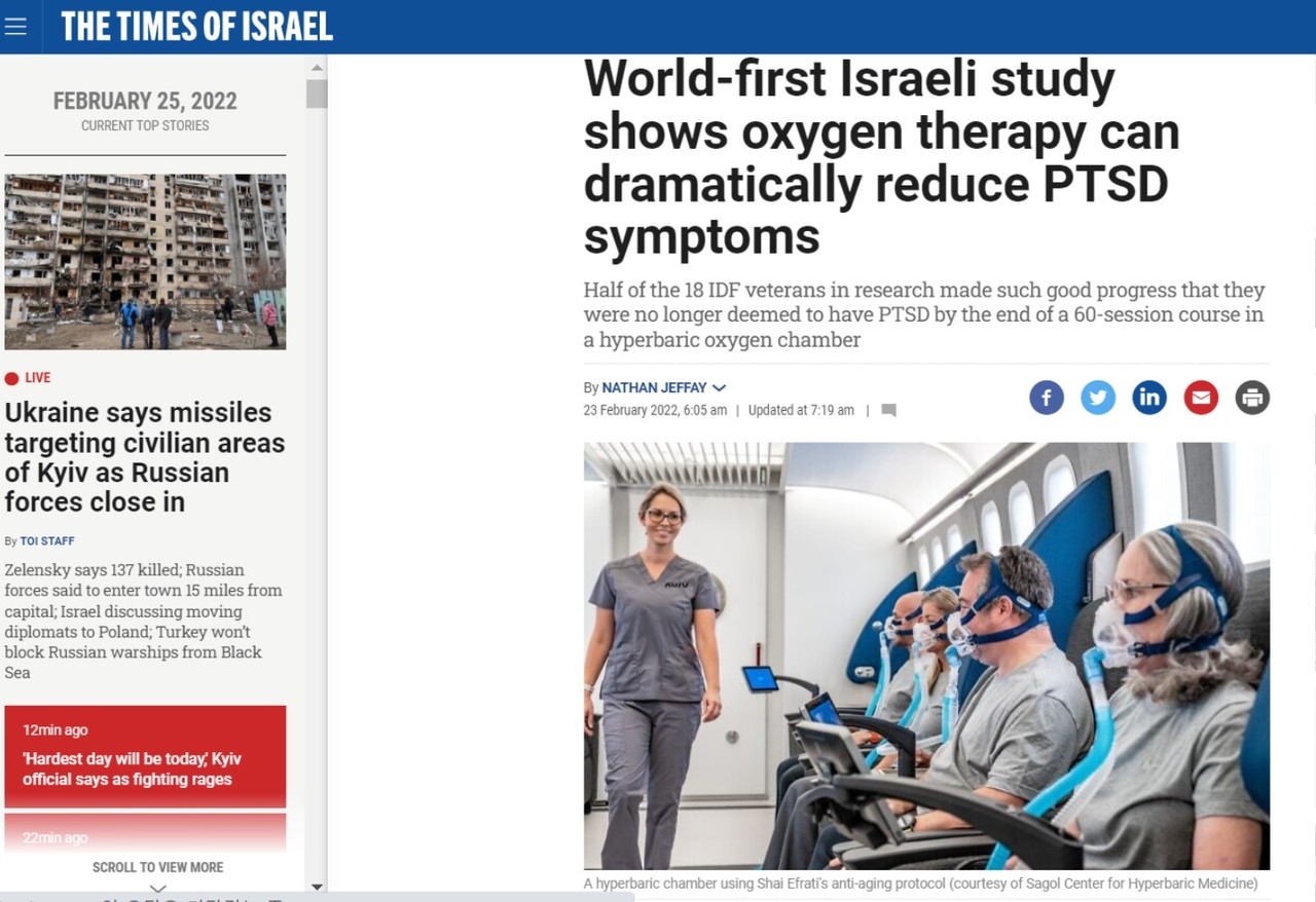 '이스라엘 타임스(The Times of Isreal)'에 따르면, 이스라엘 텔아비브대 메디컬센터 사골(Sagol) 고압산소 의학 센터의 샤이 에프라티 교수 연구팀은 ‘가자 전쟁’ 참가 후 PTSD를 겪고 있는 이스라엘 전역 군인 35명을 대상으로 진행한 임상시험 결과 이 같은 사실이 확인됐다. 이 연구는 온라인 과학 전문지 ‘공공 과학 도서관(PLOS One)' 최근호에 발표됐다.