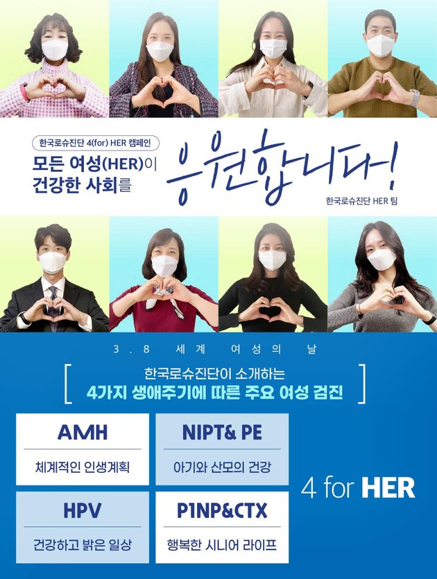 이에 따라, 한국로슈진단은 올해 세계 여성의 날의 미션에 발맞춰 ‘모든 여성이 건강한 사회를 응원합니다’라는 슬로건 아래 ‘4(for) HER 캠페인’을 진행했다. ‘모든 여성(HER)을 위한 4가지 생애주기별 검사’라는 의미를 담은 이번 캠페인명은 한국로슈진단의 여성건강 포트폴리오 TF팀인 HER(Healthcare Empowerment with Roche)팀이 지향하는 국내 여성 질환 및 진단 검사의 인지도 제고와 여성 건강 증진에 대한 바람도 함께 의미하고 있다고 설명했다.